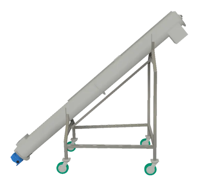 Está equipado con una tolva de recepción, 4 ruedas giratorias de 5″ con freno, una caja de control «ON/OFF», un botón de parada de emergencia tipo hongo, y un cobertor superior con bisagras.
